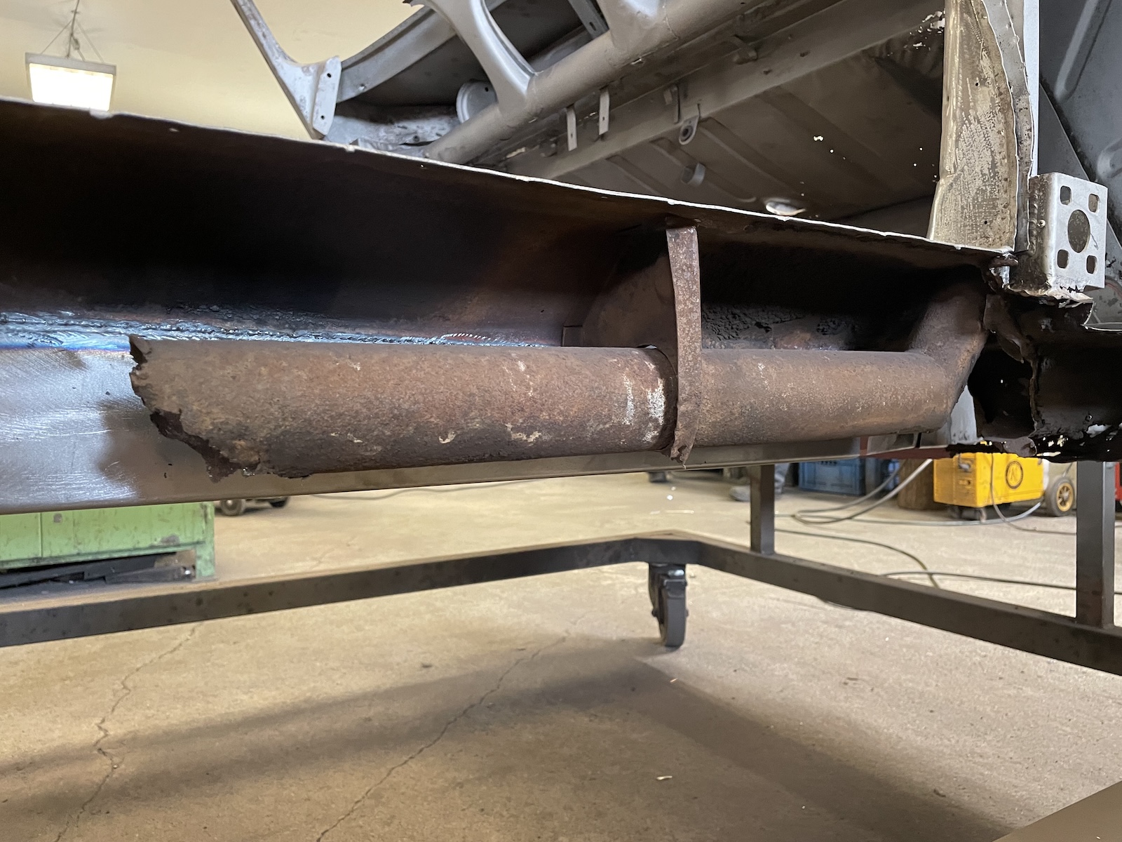 Odstranění veškeré koroze, oprava poškozených částí karoserie, důkladně se musí projít všechna místa, zde je vidět potrubí pro přívod vzduchu,které je skryté uvnitř prahu vozidla.