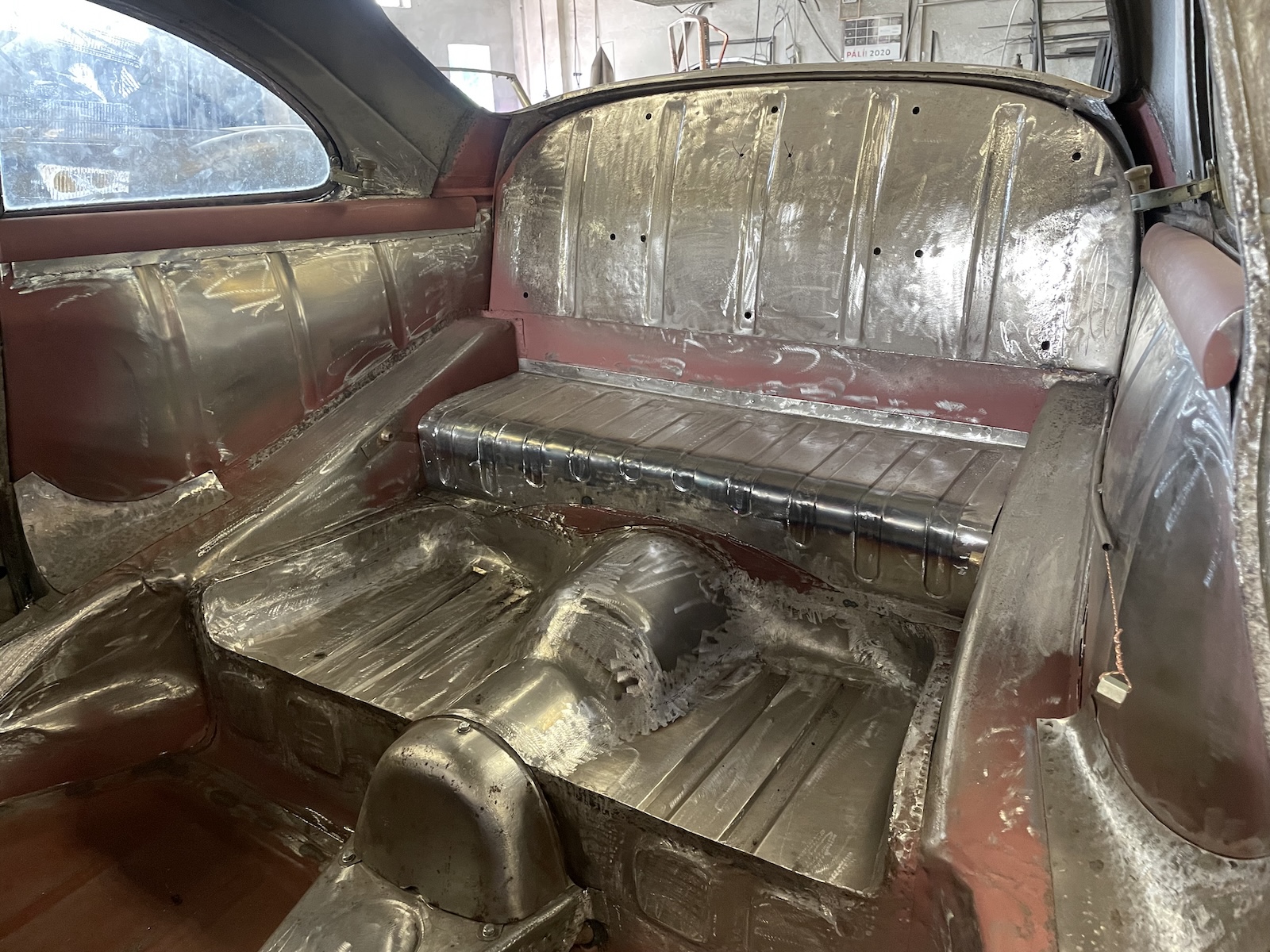 Vozidlo po kompletním rozebrání veškerých mechanických součástí prošlo ruční přípravou karoserie, která byla následně opískována a takto již připravena pro začátek klempířských prací.